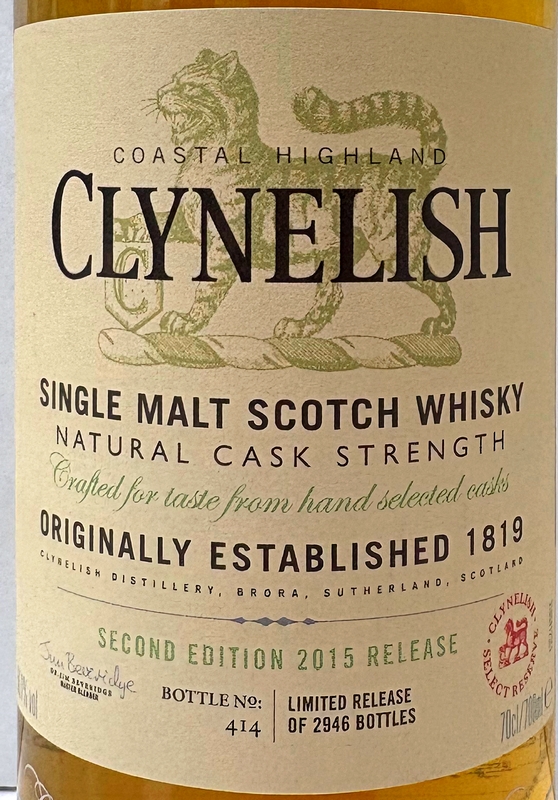 控えめであるが、最初に期待していなかったクリーミーなバニラ、バターたっぷりのスポンジケーキが表れたあと、クライヌリッシュ特有のワクシーさ、霧や苔で覆われた荒地の香りの中に青りんごの香りが浮かび上がる。その後、熟したりんごを思わせるフルーティーさを伴う刺激を感じる。加水するとシリアルや麦芽の香りが浮かび上がり、キャラメルやバニラファッジの香りを赤いベリーの香りが引き締める。本当に幸せな香り。