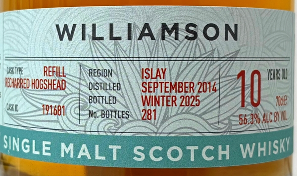 香りはワイルドでピーティーなアイラモルト、スモークが立ち上り、塩気、かすかなスパイスと、塩漬けハラペーニョ、味はオイリーな食感が口内を包み込み、スモークの奥に甘いモルト、フルーティ、カシスのタルト、ブラックペッパー&チリソース、フィニッシュはスモークと口の中に拡がり、微かな灰が残る。